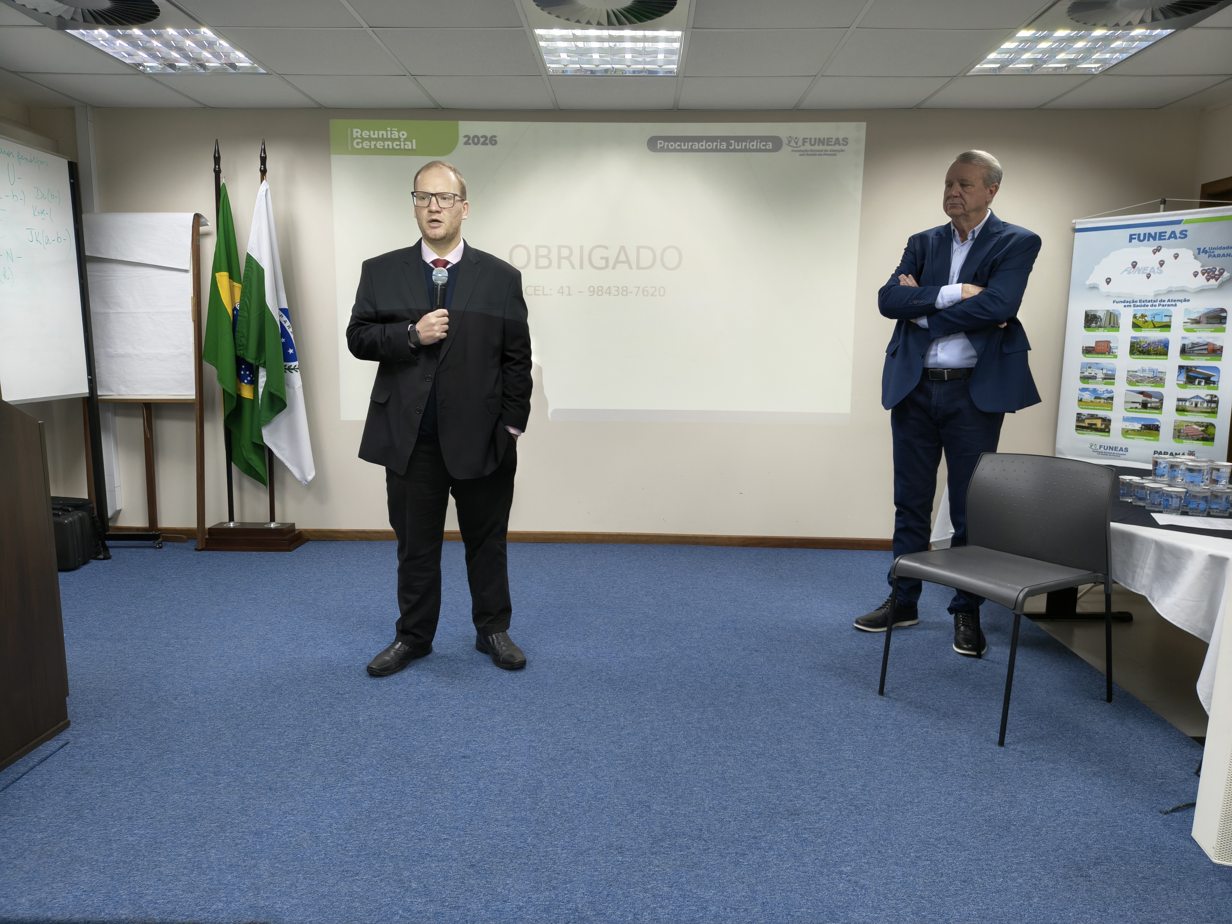 Diretores das 14 unidades administradas pela Fundação Estatal de Atenção em Saúde do Paraná (Funeas) participaram da primeira reunião gerencial de 2026, realizada nos dias 20 e 21 de janeiro, no auditório do Centro de Medicamentos do Paraná (Cemepar).